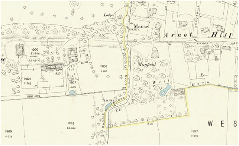 John Russel was the second son of James Russel, solicitor, of the Falkirk legal firm of Russel and Aitken. From 1832 he lived with the family at Arnotdale and became a partner in the firm. By the 1850s he was ready to set up his own home and through the firm’s contacts was able to acquire around six acres of farmland on the east side of Maggie Woods Loan to the south of Arnothill Lane from Forbes of Callendar. The site was on the west side of Falkirk, about a quarter of a mile from his parental home. The land started at the crest of the west/east ridge where it was bounded on the north by the vestiges of the ditch of the Roman frontier known as the Antonine Wall. A narrow hedge-lined path led along this ridge and was a very popular Sunday walk for the inhabitants of the town. Here there was a small plateau suitable for a house with panoramic views in all directions. The ground then sloped rapidly down to the south into the flat-bottomed valley of the West Burn. This was a minor stream with its rise just a few hundred metres to the west in North Bantaskine estate. North Bantaskine was bounded on the east by a tall stone perimeter wall that ran alongside Maggie Wood’s Loan. To the east lay the estate of Gartcows. The grounds of Mayfield took in part of the south bank of the stream to give a good flat open area where Russel intended to place a walled garden and a fish pond. Arnotdale had a well-established arboretum and Russel evidently inherited his father’s enthusiasm for the exotic trees species then becoming more readily available. In 1855 work began on laying out the grounds and constructing the house. Initially three acres were retained in crop and in 1857 potatoes were planted in preparation for introducing a formal garden. James Love noted that Russel “in a few years’ time and at considerable expense succeeded in transforming another “waif of nature” into a pretty and inviting retreat.” It was not all plain sailing and in 1856 a severe storm, described as a hurricane, blew down many of the trees and damaged the exotic plants.