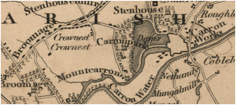Mount Carron was situated on the north side of the Furnace Lade for Carron Iron Works close to the south-west corner of the Carron Dams in the parish of Larbert. It was built around the year 1765 for Thomas Roebuck who was one of the original partners of Carron Company, which had been established in 1759. William Cadell junior, the managing partner, had constructed Carron Park on the summit of Hungry Hill (renamed Carron Hill) a little to its north in 1763.