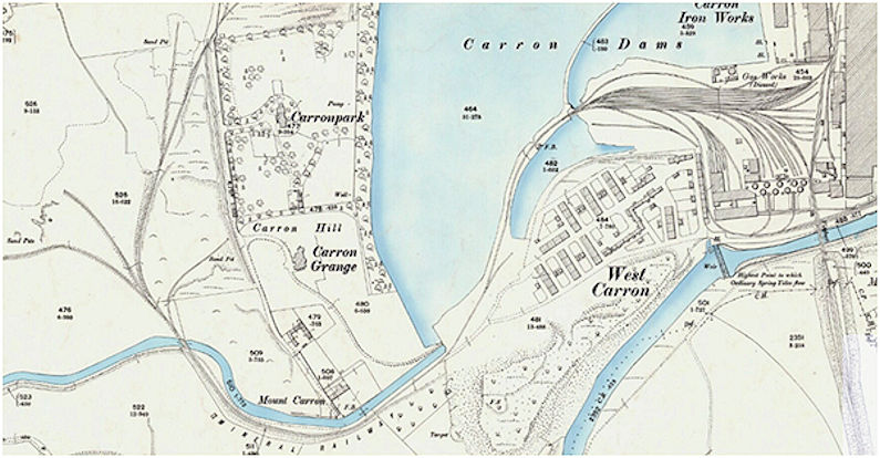 Between 1895 and 1897 the nearby village of West Carron, owned by Carron Company, was augmented by over 200 houses to house its workers. Closer to hand, a handsome mansion house called Carron Grange was erected for the manager on the ground between Mount Carron and Carron Park. A lodge was built at the junction of Cadell’s Entry and the main road to control vehicular access.
