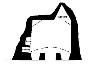 The facade consists of a central triangular-headed doorway echoed by a window on either side. These have broad backset dressed sandstone margins and reflect that on the main door of the house itself. They contrast with the rendered rubble walls, capped by a plain eaves course that holds back the vegetative cover. Small boulders form drystone flanks to the main facade and are in turn sandwiched between the outcrops of bedrock. A drain has been incorporated into the boulders on the west side.