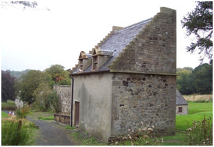 Up until this point the stables or offices had been located 195m to the north of the house (just to the south of the present visitor car park). They were in the form of a small quadrangle and would have been close to the estate entrance before the old public road was closed off. They would typically have contained the coachhouse, hay loft, stable and tack house. They are shown on Grassom’s map of 1817, but were demolished soon afterwards. A new steading was erected on the hilltop above Muiravonside House to take their place. The eastern range has a neat elliptical arch for the coachhouse with a square hayloft door set above it and a circular louvred vent above that – all with backset margins. These are set within an elongated stubby tower with crowstepped gables. Single storey wings to either side, also with backset margins and a crowstepped gable, would have been used as stables. This façade was evidently meant to be seen and it would seem that this wing stood in isolation for a decade or so. A tall wall against its south side formed one side of a small walled ornamental garden with a lectern style doocot on its north-east corner. This has two ornate dormers for the pigeon holes.