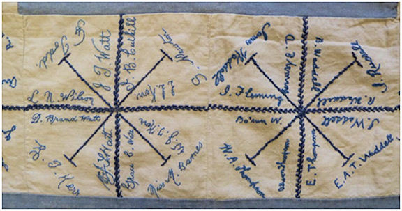 The names appear to be those of the local people living on and around the Muiravonside estate. It is a unique record and reflects the continuing close relationship between the family and its tenants. The bedspread may be the “Blue and flowered sateen down quilt” listed in the nursery (bedroom 3) at Muiravonside House in 1928. In September 1946 Mrs Arthur Stirling of Muiravonside House lent tapestry and embroidery work to the Muiravonside Horticultural Show held in Maddiston School and such an item would certainly have been of local interest.