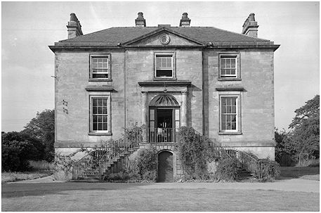 The building was a simple substantial rectangular block comprising a basement, two principal storeys and an attic. The masonry was of droved ashlar, the grey sandstone probably coming from a quarry at Dunmore. A plain band ran round the house at first-floor level and the walls finished in a moulded eaves-cornice above which there was a plain blocking-course. The roof was hipped and slated and the large chimney stacks were of dressed stone. The principal facade faced north-west towards the entrance drive from Airth. The focus of the façade was the central main entrance with its semi-circular fanlight framed by a Tuscan portico approached by a semi-elliptical perron with dual ascent incorporating an ornamental cast iron balustrade.
