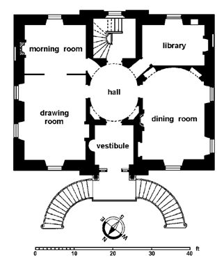 The front door led into a vestibule or lobby with a curved niche and in turn led into an elliptical hall or saloon. The saloon rose to the second floor where there was a gallery giving access to the bedrooms and was lit by an ornate skylight. The gallery was reached by a geometric staircase on the opposite side of the hall from the vestibule. From the hall all of the ground floor apartments opened up. These comprised a drawing room and morning room on the left and a dining room and library on the right – all of which possessed marble fireplaces.