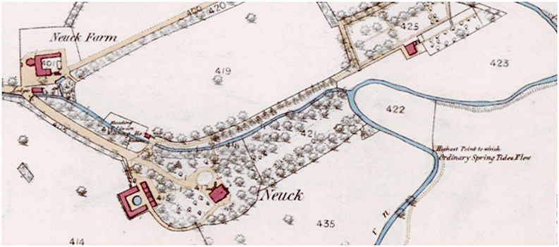 A broad avenue ran through the trees to the turn of one of the meanders of the Pow to the east and lined up with the ferry on the Forth. The woodland and shelter belts provided habitats for the game on the estate and the shooting rights were considered to be important. The mill leat for the 16th/17th century mill of Patrick Higgins (Reid 2004, 64) still ran through the estate and its water was used to support a bleaching green and washing house. The lade began a little to the east of the A905 and followed the contour to the lodge building which guarded a bridge over it. The early mill building had probably stood just behind the lodge where vestiges of water courses can be seen on the later maps. The land around Neuck is quite flat and the water did not have much of a fall, consequently this mill was abandoned in the early 17th century in favour of a tidal mill at Higgins Neuck – New Mills.