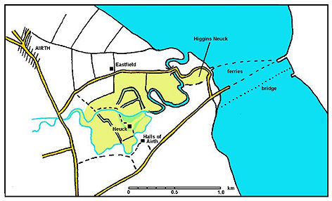Neuk is Scots for a corner or recess and is consequently often found as a place name.  There are two such places in the Falkirk district – one in a meander of the Pow of Airth and the other in a crook of the River Avon and now known as Muiravonside Park.  The spelling is often phonetic and can change with time.  The most common variants are Neuck, Nuicke and Newck.  Compounded examples are also found and Headswood Neuk, Mossneuk, Parkneuk, Polmont Neuk (Avonside), Lady’s Neuck and Manor Neuck are all found in Stirlingshire (Reid 2009. 155).  The Neuck in the parish of Airth which is the subject of the present article was owned by the Higgins family for many generations and so part of it became known as Higgins Neuck.  Their gravestones can be seen in the old parish churchyard nearby.  The family had initially been connected with Halls of Airth but in 1681 Patrick Higgins received a charter from Richard Elphinstone of Airth of “all and haill that room and mealling of land commonly known as Newk” (Reid pers com).  The name Halls of Airth is derived from Haughs of Airth – haugh being a river meadow.