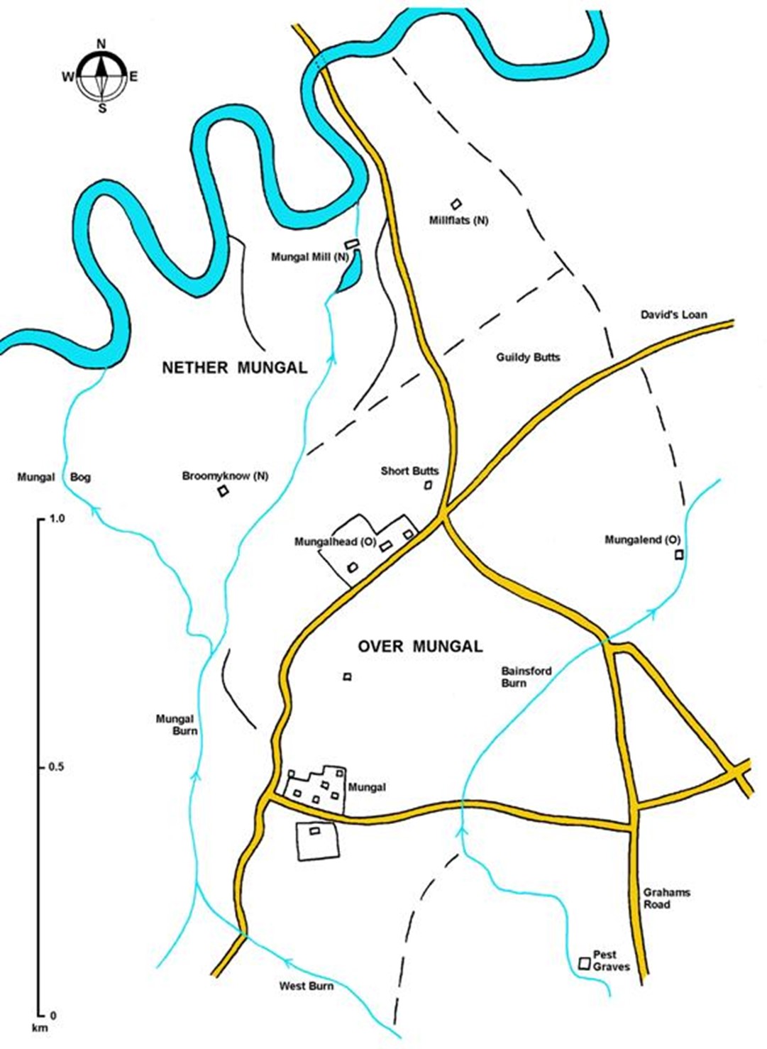 Peat was used extensively as a fuel and so it is likely that the extent of the moss was gradually diminished over the centuries. Water was also diverted away from the bog by channelling the main flow of the burn eastward to a meander further down-river. This had the major benefit of allowing its waters to be used to drive a mill close to the point where they entered the river. Mungal Mill is mentioned in the early charters and was held by the Priory of Manuel until 1568 when Joanna Livingstone, the prioress, granted the corn mill and the mill lands to John Livingstone of Dalderse. By the end of the 15th century, and presumably long before that, the Lands were divided into Over Mungal and Nether Mungal, both of which were thirled to the mill. Although obscured by later patterns of ownership, it appears that Nether Mungal occupied the northern portion or low-lying part and Over Mungal the southern or dryland.