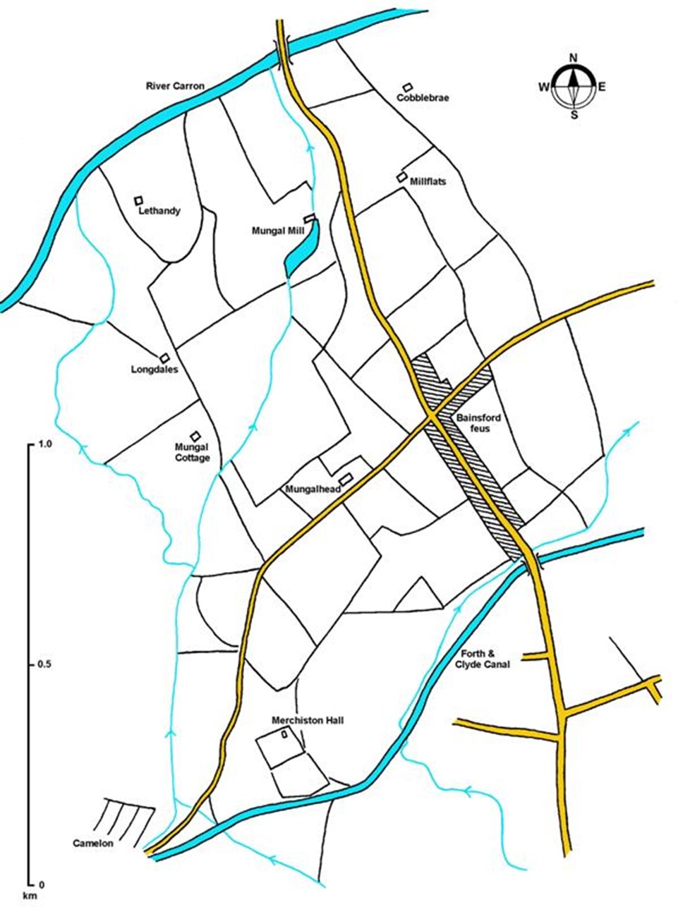 “The Lands of GUILDY BUTTS, consisting of 27 acres or thereby; and also, part of the Lands of OLD MUNGALHEAD, consisting of about 11 acres; and likewise about an acre and a half opposite to Mungal House, lying along the south side of the Canal. These lands lie between the great Canal and Carron Works, are of an exceeding fine soil, and from their situation may be turned to various advantageous purposes. They will be sold separately, or each of them in different lots, as purchasers shall incline. And as the Lands are out of lease, the purchasers may enter to the natural possession at the term of Martinmas next.