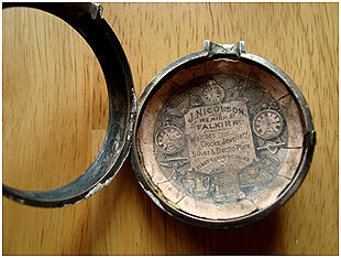 After carrying out a repair or cleaning of a pocket watch it became customary for watchmakers to insert a watch paper into the back of the case as a form of advertising.
