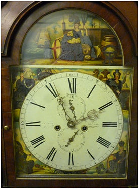 1997-45-1 – White painted dial “GEO HILL BO’NESS”. The painted spandrels depict the four continents – “EUROPE” showing Britannia with her arm extended in front of a white horse and a warship; “ASIA” has a woman holding a scimitar in her right hand and a book in her left, a camel to the left and a pyramid to the right; “AFRICA” has a black woman with a bow and arrow with round huts in the background; “AMERICA” is written on a tobacco barrel and the woman next to it has tobacco leaves in her headdress. In the arch is a scene of commerce showing Britannia holding a trident with a lion at her feet. A globe at the front right in front of a sack of “COTTON” and a barrel emphasise trade. In the background is a fort and sailing ships. The scene is captioned “BRITANNIA AND ST GEORGE”.