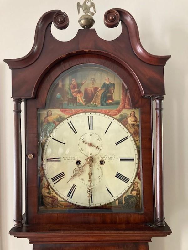Private collection. White painted dial “WILLM DOBBIE CLOCKMAKER; TO THE QUEEN FALKIRK”. The spandrels show the four seasons with a seated woman appropriately clothed for each. In each she wears a long tartan skirt. Spring is shown with a bunch of grapes; summer holding a wreath; autumn holding a sickle; winter wearing a shawl and with her hands firmly enclosed in a muff. The scene in the arch shown a man and women seated by a table in a panelled room; he plays a musical instrument. It probably represents Rizzio and Mary Queen of Scots.