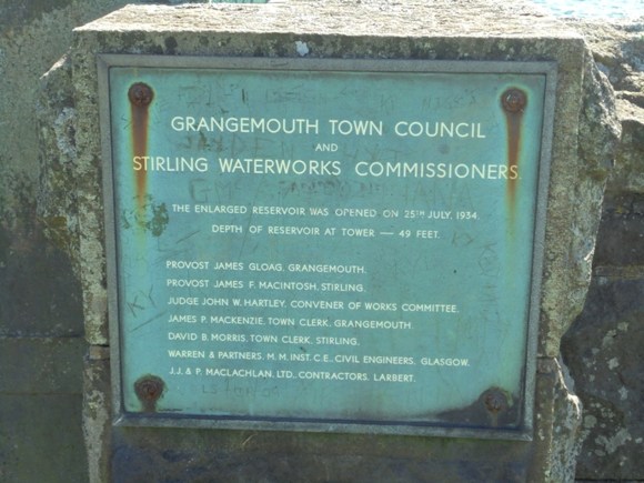 “Grangemouth Waterworks, Bannock Burn Reservoir Presented to Provost Mackay on the cutting of the first sod on 27th October 1905. Warren and Stuart, engineers, Glasgow; Casey and Darroch, contractors, Glasgow; A.Y. Mackay, Provost; James Weston, Bailie; Edward Wood, Bailie; Robert Main, Councillor; John Gilmour, Councillor; Henry Walker, Councillor; J. Burnett-White, Councillor; James P. MacKenzie, Town Clerk.”