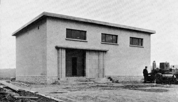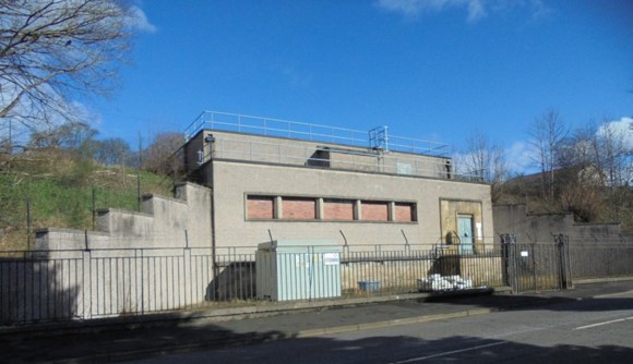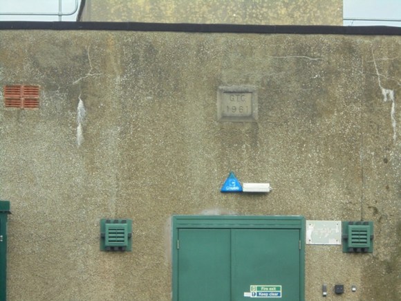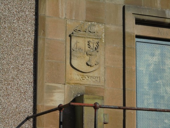 The new service tank at Salmon Inn was designed by Babtie, Shaw and Morton of Glasgow, Grangemouth’s consulting engineers. It was situated on high ground to give the appropriate delivery pressure of the water. The reinforced concrete tank holds three million gallons of water to a depth of 16ft when full and was built into the hillside and partially covered by earth. As well as the storage tank there was a valve chamber. Outside, only the western façade was visible and Henry Wilson, architect, was asked to design it. It is typical of the period being of rendered brick with a horizontal line of blank windows and flat roofline. At the south end is a doorway set in an ashlar stone surround with the Grangemouth coat-of-arms to its left. On the door lintel is the date “MCMLII” being 1952.