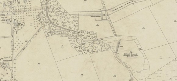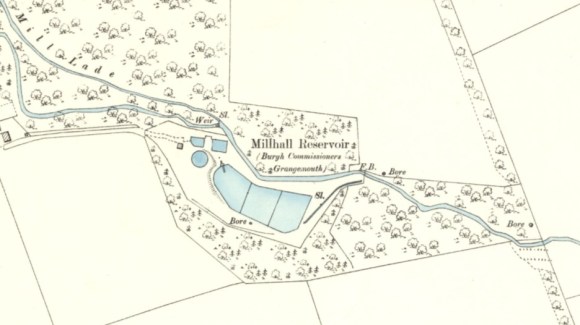 Mr Burrell, the shipping agent, noted that when he arrived in Grangemouth in 1856 his old landlady used to go for water to the canal with an empty bucket in one hand and a slop-pail in the other, and she filled the former after having emptied the slops into the canal! The Easter Timber Basin was used for repairing barges as well as washing horses. Children also swam here, close to the intake pipe. Not surprising therefore that typhoid fever was rampant in Union Place in 1868. In the absence of sand or gravel filtering the consumers were advised to boil their water. Mutterings were made about adopting the Lindsay Police Act to allow a raised reservoir to be cheaply constructed at the site of the Orchard on the east bank of the Grange Burn. It would have utilised the existing banks which survived from the medieval grange and which can still be seen in Zetland Park. It had been thought that the water supply to Kerse House, which came all of the way from Tammy Mills Well in Laurieston, was at least wholesome, and the surplus was shared with some of the town’s residents. However, the piped water from Laurieston was analysed and found to be even more dangerous. Shortly afterwards the Earl of Zetland and the Caledonian Railway Co announced an intention to set up a Water Trust and explore the Earl’s land at Millhall for the source. Millhall is just over two miles south of Grangemouth on slightly elevated land.