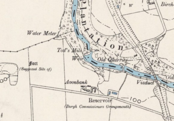 Instead, in July 1885, reports were made on the springs at Avonbank, a mile to the east of Millhall, by Mr Leslie of Edinburgh, and William Black of Falkirk. The springs were analysed and found to be thoroughly satisfactory for domestic purposes. Negotiations were started with William Forbes of Callendar for land which was acquired at valuation. Thomas Learmonth Livingstone of Parkhall owned the neighbouring estate of Avondale which also had springs which were to be utilised, and wayleaves were acquired for the pipeline to Millhall. The works were built just to the east of Avonside Farm and consisted of a large tank or reservoir into which the water permeated through a filter, bottomed with fine sand from the island of Arran. The new works – tank, filter, pipes and so on – cost upwards of £2,000. To meet this expenditure the Public Loan Commissioners provided £2,500 and repayment with interest at 3.5% was made over the next 30 years. Considering that the old Millhall supply, consisting of 100,000 gallons per day, had cost the town £11,000, the expenditure of between £2,000 and £2500 for the new supply giving an additional 125,000 gallons per day, was very moderate. The work was carried out by Stark & Son, contractors, Auchenstarry, under the supervision of William Black.