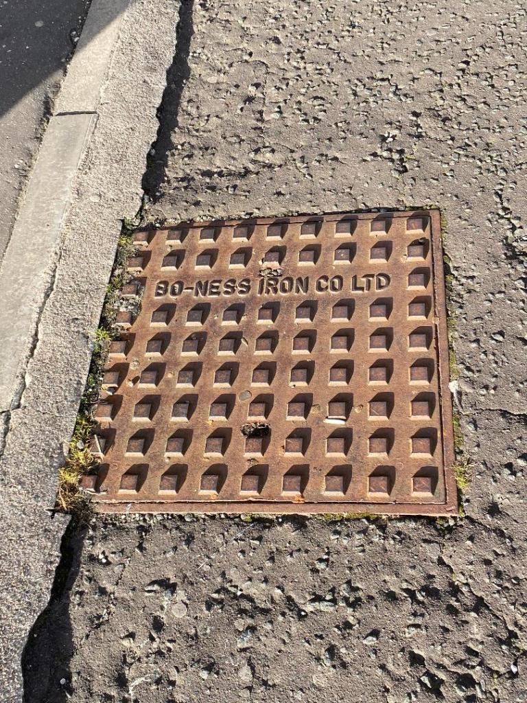 Drain Cover: Ref 2020/10 : Lumley Street area, Grangemouth : Square with an outline. Sunken square studs 9 x 9. Foundry name in place of 3rd row of studs. : Photo, David Thom.
