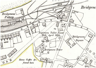 1865, July: Iron making began in July 1865, but stopped after only six months. Only one of the two furnaces was ever in blast. They cost £5,300 to erect. The complex included a 4-storey engine house with a large, second-hand, Cornish blast engine. The furnaces stood at the foot of the escarpment north of Bridgeness Tower which allowed them to be loaded from the hilltop.