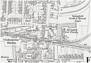 1876:  Second foundry built by Cockburn (Gowanbank), beside the goods yard at Grahamston.  According to Gillespie it was first called the “Vulcan Foundry (Gillespie, R 1879, p.40).  The site had been a manure depot and covered some 3 acres with the water supply coming from a 150ft deep well supplemented by the town supply during the summer.  It was managed by his son, Malcolm Cockburn, and became known as Young Malcolm’s.  Most of their castings were for the Davis Gas Stove Co of London, and W Davis provided financial backing along with several other London merchants.  Doctors Moffat and Hamilton objected to the site on health grounds, but to no avail.