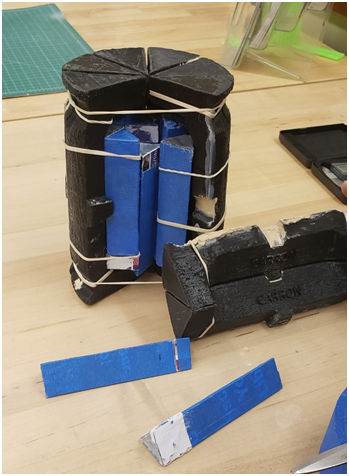John Kerzaya has pointed out that in addition to the 8 interlocking outer pieces of cast iron, four of which were found at Yorktown, there would have been a set of 8-12 inner pieces of equilateral triangles (4½ins long), some of which were also recovered during the excavation.  The outer pieces and prisms would have fitted together to form a cylindrical shell of about 16 pieces in total.  They were probably tightly bound with cordage or rope at the notches at either end which, when fired from a gun, would disintegrate and scatter the cast iron sections like a shotgun.