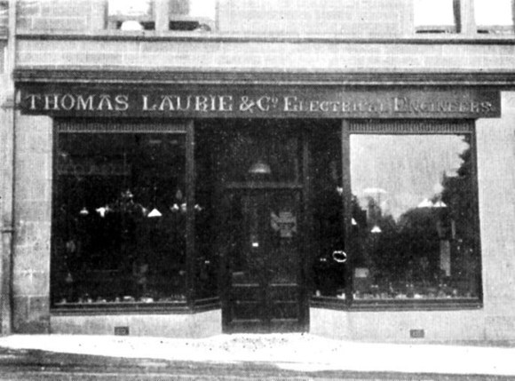 “ELECTRIC LIGHTING AND TRANSMISSION OF POWER, TELEPHONES, ELECTRIC MINING AND HOUSE BELLS, Lightning Conductors, Speaking Tubes, &c. Short Distance Telephones, £3 per Station. All Work Guaranteed. Established 12 years. THOMAS LAURIE & CO., ELECTRICAL ENGINEERS.” (Falkirk Herald 28 July 1894, 8).