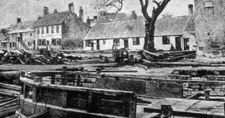 By 1759 there was a motley collection of ships based at the port and the village had 30 or so substantial houses belonging to merchants, mariners and related tradesmen. Then the Carron Company arrived and took over the lease of the harbour, changed its name to Carronshore, and stepped up the scale of operations. A new stone-built wharf with cranes was constructed at the east end of the village for the company’s exclusive use. Behind the wharf arose a substantial warehouse known as the “granary”. Attached to it was a stately home for Charles Gascoigne, the manager of the Garbett Shipping Company. Nearby they created further stores, workshops, a smithy, a carpenter’s yard and a pitch works with a rope walk. A dry dock enabled the company’s boats to be overhauled. To cope with the increased level of activity the Carron Company brought in more workers and built new houses at the north end of the village. In 1783 the population was put at 730.