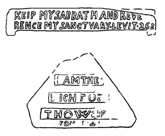 1 – Door or window lintel carved in relief “KEIP MY SABBATH AND REVE/RENCE MY SANCTUARY. LEVIT.26 2”. This is taken from Leviticus 26.2 and the full verse reads “Ye shall keep my Sabbath, and reverence my sanctuary: I am the Lord.” (length 1.68m).