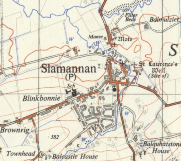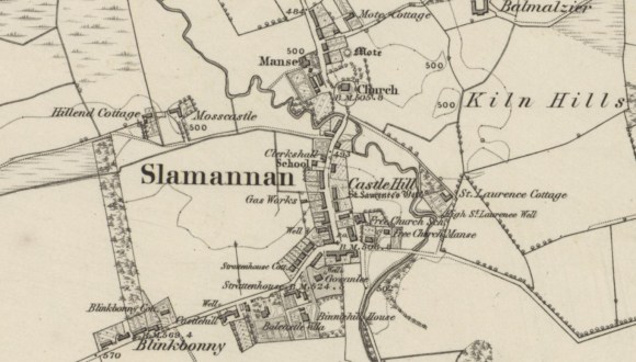 Slamannan is located 6 miles south-south-west from Falkirk at 500ft above sea level. The old medieval parish church was built adjacent to a 12th century motte at an important crossing of the River Avon. This then was the centre of temporal and ecclesiastical power in the parish, with a small hamlet in the bailey to its south and east served by malting kilns at Kill or Kiln Hills. Until 1730 the parish was bounded on the north by the river. At that date a portion of Falkirk parish was annexed to the parish of Slamannan, otherwise known as St Laurence. The parish was about six miles in length from west to east, by three miles in breadth.