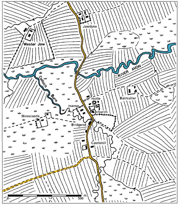 Balcastle housed the baronial mill and this attracted a huddle of thatched dwellings. This hamlet was also known as Gateside, which simply means “road side” and often refers to one of the main through roads. Up to the early eighteenth century this road provided a southern route from Glasgow to Edinburgh. It had been used by Cromwell’s army in 1651. East from Balcastle it crossed the Avon at the mill and proceeded to Balquhatstone House and on to Pirney Lodge (most of this last section later forming a private drive for the big house).