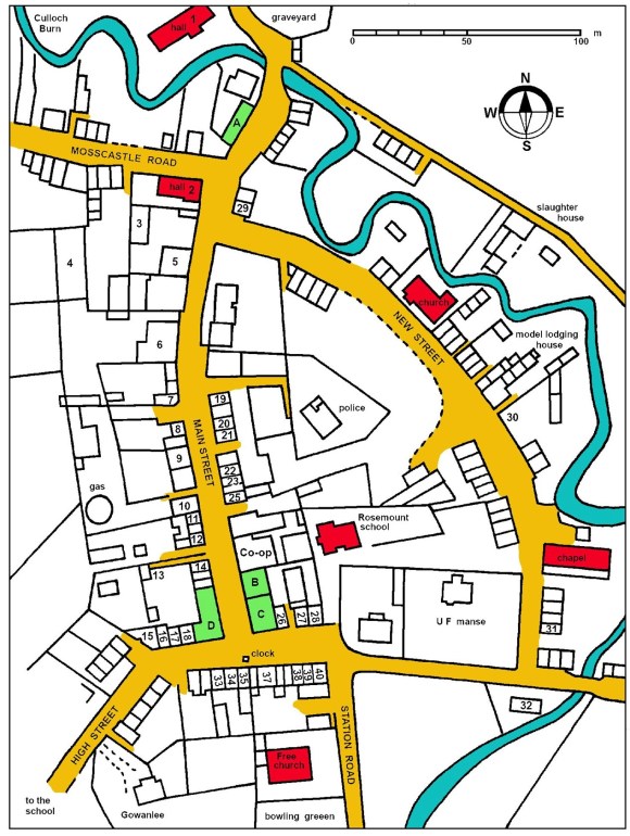 10 – Thorn (Peeweep); 11 – Newfoldyke; 12 – Drumclair (School & Quarry); 13 – (Long); 14 – (Tarry); 15 – Lochside; 16 – Lochend; 17 – Barnsmuir; 18 – Greenhill; 19 – Lodge; 20 – Salterhill; 21 – Balquhatstone; 22 – Strathavon. The sites of Porch, Red and Woodside Rows are not shown.