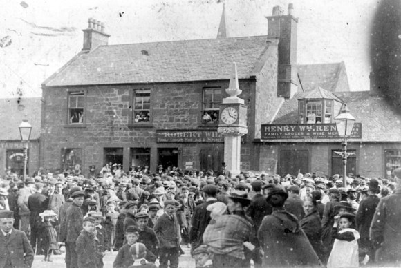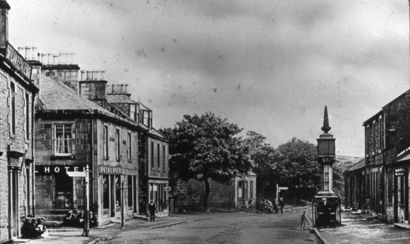 The new shops and houses opposite the St Laurence Inn had been deliberately set well back to create this market ground. Indeed, for this purpose the road southwards had been moved to the east so that the Cross presented a T-junction rather than a crossroads. In 1857 the open space was referred to as “the Common” and it was suggested that a public well should be sunk there (Falkirk Herald 12 February 1857). That April there were 100 head of cattle and 30 horses sold at the Fair.