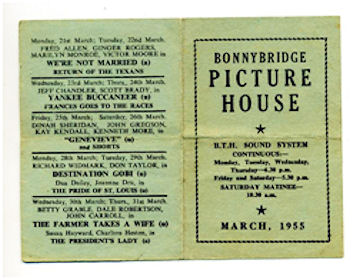Henry Harris continued his charitable work and his annual free Christmas entertainment, collecting money for the Old Folk’s summer outing. In October 1939 plans for a new veranda were submitted to the Dean of Guild Court by Thomas Copland, architect, Falkirk. It was not an auspicious time and building work was put off until the end of the war. During the Second World War money was given to the Aid to Russia Fund, the Red Cross Prisoners of War Fund and others. It is claimed that Harris was the only cinema proprietor in Scotland to admit free of charge to his entertainments all members of HM Forces. Soldiers were billeted in the village and those wearing their uniforms got free entry each weekday.