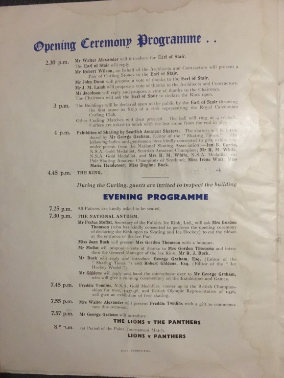 Opening Programme Courtesy of Keith Birnie, here, in its entirety, is the Souvenir Programme of the Opening of Falkirk Ice Rink Share this: Click to share on X (Opens in new window) X Click to share on Facebook (Opens in new window) Facebook Like Loading...