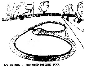 The 1950s was the main period for paddling pools and during the hot summers they were a great boon. One of the last pools to be installed was that at Dollar Park which was funded by the Falkirk Round Table in 1963. Most had been round or square, but this one was kidney-shaped and even had a bridge. However, the teenage youths soon got to work on these recreational facilities and the cost of maintaining them rose to prohibitive levels. The damage caused by vandalism was on many levels. Throwing stones in to muddy the water was one mild form; using broken glass was more dangerous and resulted in many of the younger children wearing jeelies – plastic sandals. Other pollutants were used and physical damage to the walls occurred. Attacking the source of the water and adjusting water levels was also dangerous. Inevitably the purity of the water declined and one by one the ponds were abandoned.