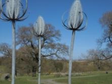 Modern works of art were also inserted into Callendar Park and their silver metallic finishes provide a deliberate contrast to the antique designed landscape. One, at the east of the Loch, takes the form of a pie-chart. In 2015 a new sculpture walk was installed in the field between the car park and the visitor centre at Muiravonside and features elements of nature.