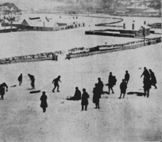 One unusual park feature was the skating pond at Victoria Park in Falkirk which was installed in late 1895. A small bank of clay puddle, 1ft 10ins tall at its highest point, was inserted into the centre of the running track to enclose an area of almost 4 acres and this could be filled with water from a specially laid pipe. In heavy frost the sheet of water froze and provided a safe skating surface for the local children as well as a convenient curling surface for the adults. It was paid for by Provost Weir. The pond was flooded in mid-November each year and usually kept in this state until late February when it was drained and the grass allowed to grow again. The skating pond ceased to function probably as a result of global warming. The shallow paddling pool in Zetland Park occasionally froze, much to the delight of opportunistic skaters. The modern extension to Callendar Loch has slowly silted up and is now so shallow that it too freezes and pupils from the nearby schools have to be rescued from time to time.