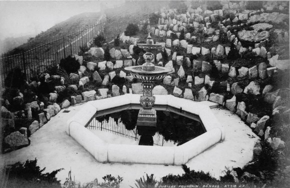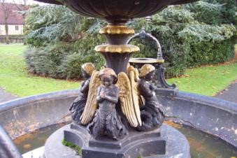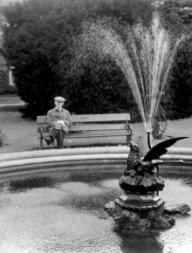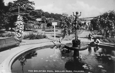 When Dollar Park was handed over to the Falkirk Town Council in 1922 it already contained a gravity fed “jet d’eau” which had been created by its owner, James Russel, in 1853. This was located in the centre of a 6.6m diameter bowl. Shortly afterwards the Gentleman Fountain in the town centre was dismantled and the eagle finial was placed in the centre of this pond, and was later replaced by the magnificent statue to Peace from south Bantaskine created by Sir Alfred Hardiman in 1918. The power of the water jet had been diminished but the lily pond with its fish was a great attraction. Sadly, it is now infilled and serves as a flower bed.
