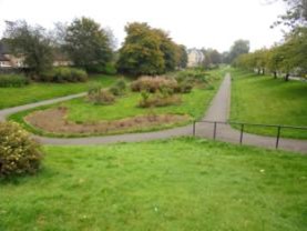 Passenger services stopped running on the Kilsyth and Bonnybridge Railway line in 1935. Central Station in Bonnybridge was still used for some goods but the line slowly deteriorated and became overgrown. Final closure came in 1964. In the early 1970s the broad cutting between the High Street and Station Road (Peathill Road) was landscaped and made into a park with the name of the “Bonnybridge Gardens,” though locals usually use the appellation of the “Sunken Gardens.” A complex of circular and helical paths linked by an axial path divided it up with the interstices filled with flower beds. A line of cherry trees along Wellpark Terrace to the west provides a flood of pink colour when in blossom.