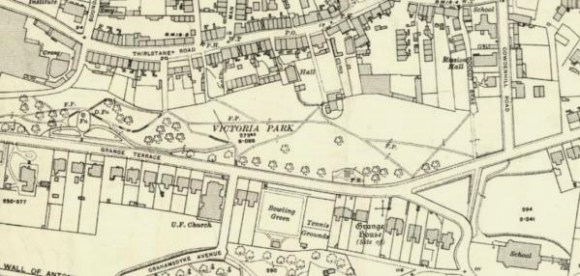 In Bo’ness the 1897 Diamond Jubilee of Queen Victoria was commemorated by a permanent memorial in the shape of the Victoria Public Park, which was formally opened by Mrs Law, the wife of the convenor of public parks, on 22 June. The ground for the Park, formerly called the “Braes,” was a sloping strip of ground on the north side of Philpingstone Road west of Cowdenhill Road. It was in grass and impossible to enclose for grazing and was used more or less as a public playground. The steep area of about 9.5 acres was feued by HM Cadell of Grange to the Town Council for £35. At the same time he created Grange Terrace as a westward extension of Philpingstone Road and feued the land to the south for building. Trees were planted along the north side of the new road by Cadell and he also created the first terrace paths throughout the park. At the opening sixteen young trees were planted by the sixteen burgh commissioners near the western entrance in the shape of a diamond and called the “Diamond clump.” The trees were mostly reared on the Grange estate. The four corners of the diamond represented the four wards of the town.