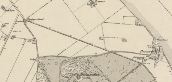 A school was built to the north of Dunmore Estate to take its workers’ children and was located near to the junction of the main Airth to Stirling road with the Moss Road. The school was not in existence at the time of the first Statistical Account in the 1790s, but the second Statistical Account of the 1840s mentions two endowed schools and this must have been one of them. It was probably relatively new at that time and had an Episcopalian ethos, reflected in its name of St Andrew’s School. The building was rectangular in plan and contained two rooms. The Ordnance Surveyors in the late 1850s described it as