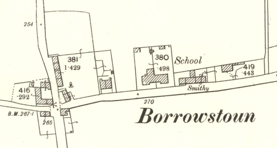 The school building stands 80 or so yards to the east of the Linlithgow Road, and about a mile from Bo’ness. Its walls are of random sandstone rubble with dressed margins and a slate roof. The main façade faces Borrowstoun Road and the two ends are slightly advance, presenting jerkin-headed gables. These gables are also used for the lower porches set in the re-entrant angles. It was 84ft long by 20ft broad, with two classrooms, a room for the master, and another for the mistress, a cloakroom for the boys and another for the girls, besides lavatories and other conveniences.