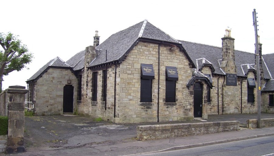 It was evident that the school would not survive and in 1945 the Education Committee started discussing replacing it and Kinneil School with one near to Bo’ness Cemetery. A reprieve seemed to be at hand when it decided in 1952 to retain Borrowstoun School for the use of stages Primary I, II and III due to the increase in house building at Newton and southwards. It was only temporary, and after the opening of the new School adjacent to the Roman Catholic Church (known as Kinneil School) the building at Borrowstoun was mothballed in 1956. For a short time it was used by Mitchie’s Hosiery. From 1964 the premises were leased on an annual basis to the Barony Players, a community theatre group formed in 1954. The Players put in a lot of voluntary work and the small Barony Theatre opened its doors in 1966. This impacted little upon the exterior, but the internal subdivisions were removed and 120 redundant cinema seats from Edinburgh were inserted on a new raked floor. The windows were blocked in. The Barony Players now has a 25-year lease from Falkirk Council and long may it do so!