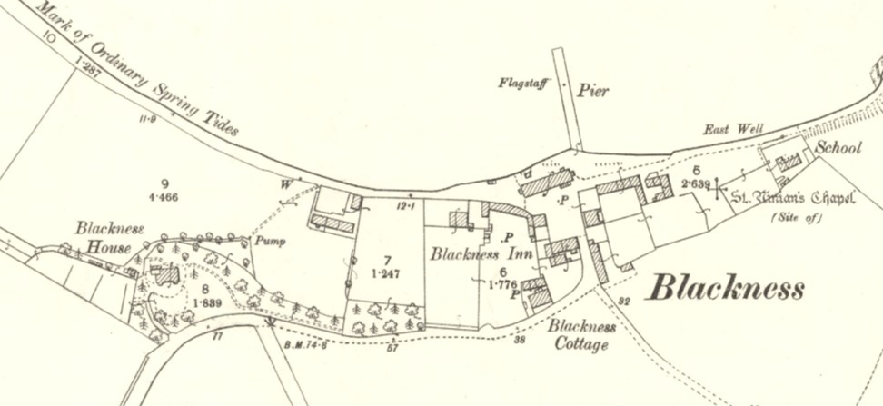 In July 1856 a bequest of £200 by the late Hon. Mrs Hope was received by the Carriden Kirk Session for the benefit of the Blackness School, suggesting that one already existed there. Around 1858 Miss Helen Hope, the sister of Admiral Sir James Hope of Carriden, established a private school at Blackness. It was newly built for the purpose at the east end of the village overlooking the shore road to the castle. The East Well lay beside the road at this point. She took a great personal interest in the schools and at the beginning of the August terms treated the pupils to milk and buns. It was essentially an “estate” school provided for the girls of the rural community.