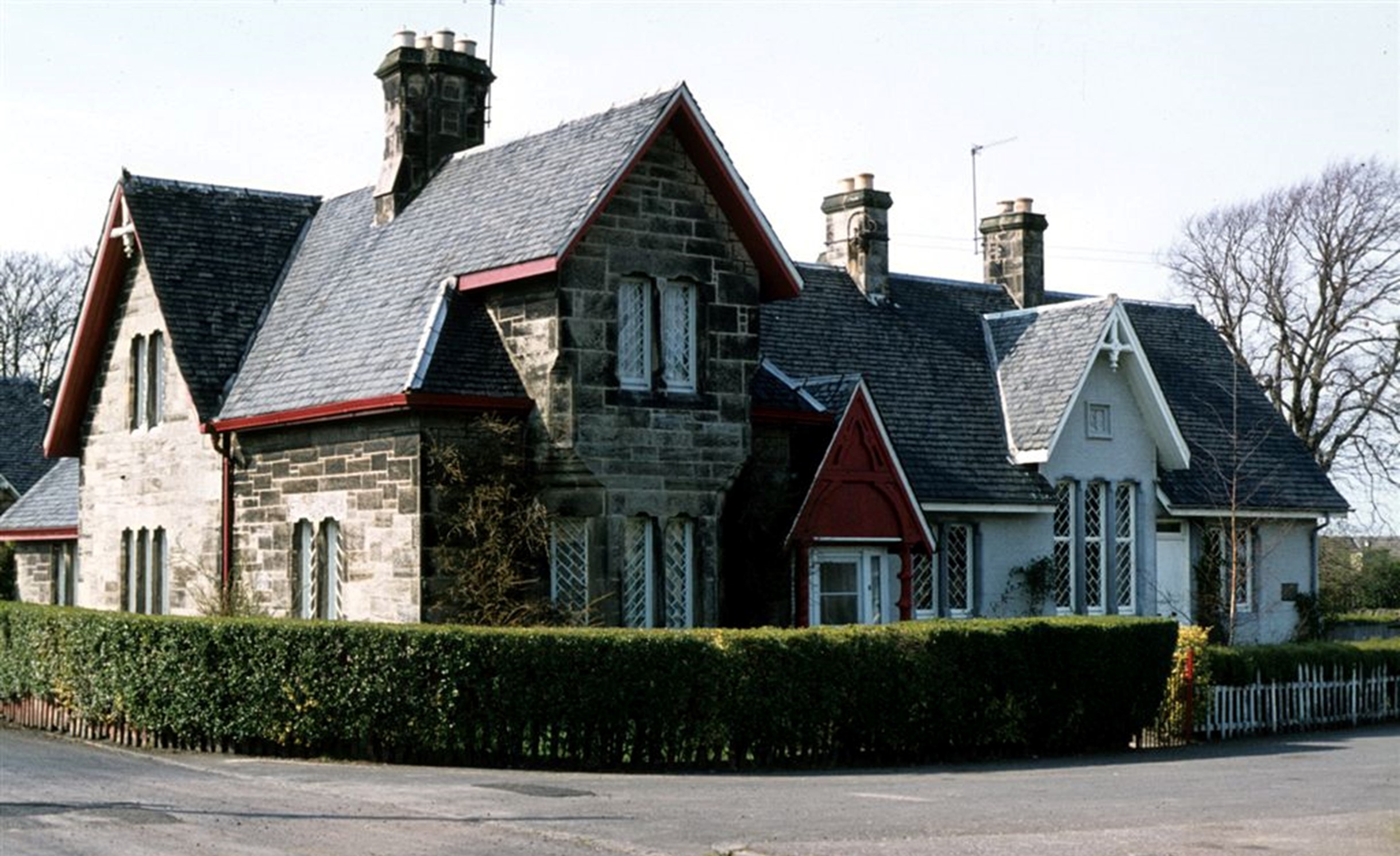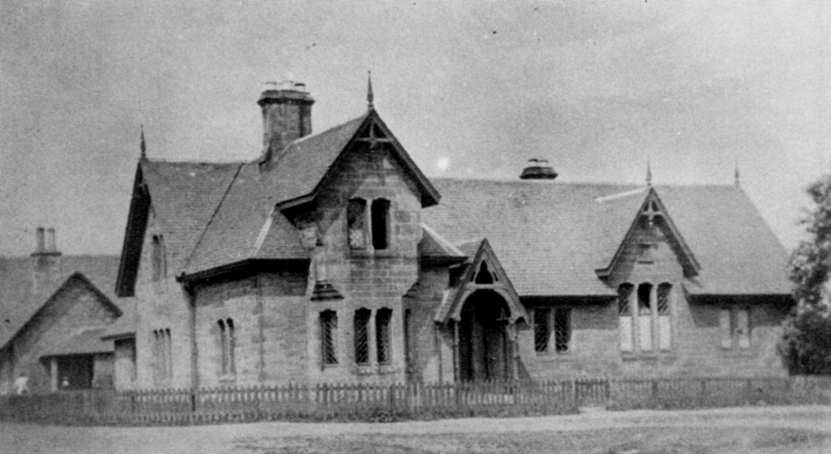 The new building at Muirhouses reflected the style of the 1844 building and was extended to the remainder of the village. It overlooks the public square on the east and is L-plan in shape with a gabled timber porch at the re-entrant angle. The schoolroom occupied the northern wing and had a gabled central bay with a moulded panel bearing the date 1866. To the south of the porch was the two storey teacher’s house with a canted bay window on the east front corbelling out to a rectangular upper gabled storey.