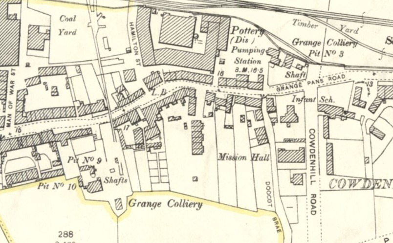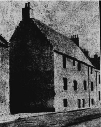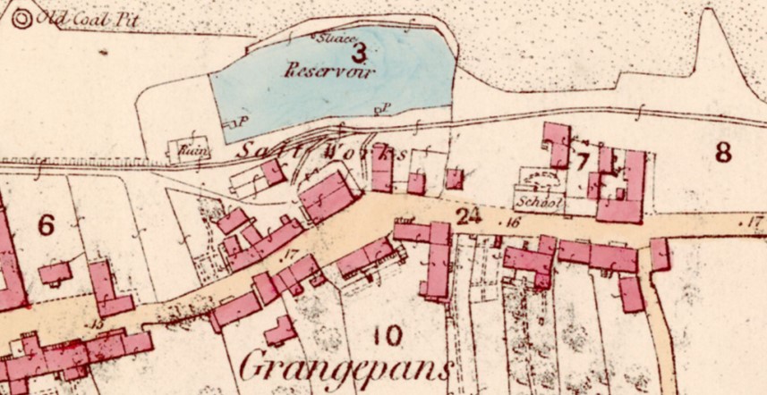 It was sometimes known as the Grange Works School because most of the children came from families connected with the Grange Colliery and saltworks, the school fees being deducted from the wages of the employees. This school was situated on the north side of the Main Street near the east end of Grangepans. A salt girnel or cellar occupied the ground floor; the whole of the second floor was utilised as the schoolroom; and the top storey was used as the schoolmaster’s house. In 1854 the Ordnance Surveyors described it as: