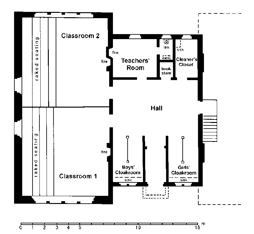 Each classroom had a fireplace on the east and raked seating on the west. The seating in the northern classroom was slightly wider, presumably for the older children. The window in the north gable was similar to that in the south gable. Between the classrooms was a wooden partition. The lower parts of the walls of the hall and classrooms had tongue and groove timber panelling. Toilet accommodation for the children was provided at either end of an open-fronted play shed built against the north boundary wall.