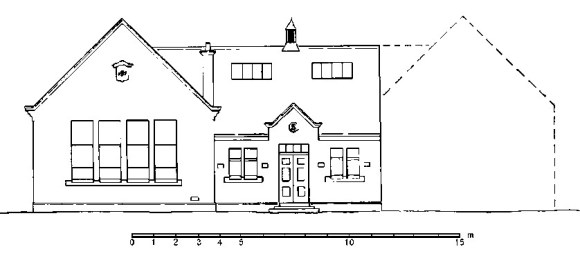 The site chosen was on the north side of the Bonnybridge to Castlecary road, just east of its junction with the main Falkirk to Glasgow road. The school building is T-shaped in plan, with gables on the north and south ends of the west wing and on the end of the east wing. The south and west walls are of local dressed sandstone, with a chamfered plinth course on the south façade. The north and east walls are of harled brick. The latter has two narrow buttresses and was designed to allow for an eastward extension if required. The extension would have been for “120 scholars” and would have completed the H-plan, making the composite structure symmetrical. It was never needed.