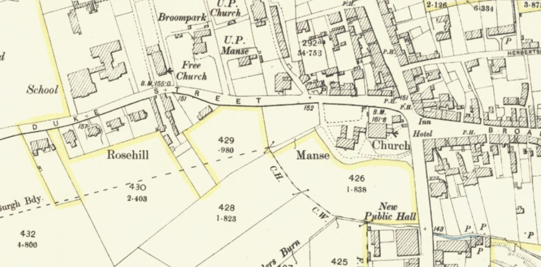Mr Kinghorn, the head teacher of the Parochial School died as the transition was being made and the School Board appointed John Gillanders of the Dunipace Free Church School in his place. In March 1874 Mrs Kinghorn was asked to move as the house was needed for the school. The Board quickly realised that the school needed to be rebuilt on a larger scale to accommodate 350 pupils. Alexander Black, architect, prepared plans of sites which were submitted to the Scottish Education Department for grant aid. 1.3 acres of land were acquired at West Boreland on the north side of Duke Street almost opposite to the old school. The school itself was designed by Francis Mackison, architect, Stirling.