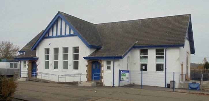 The contractors for the school were: mason work – Alexander Gray, Alva; joiner work – William Frew, Denny; slater work – David Robertson, Denny; plaster work – Robert Brownlee, Falkirk; plumber work – J & J Hardie, Stirling. Together with the dwelling it cost £3,350 and was formally opened on 15 July 1876. A prominent feature of the single-storey T-shaped building was the Gothic spire over the entrance porch.