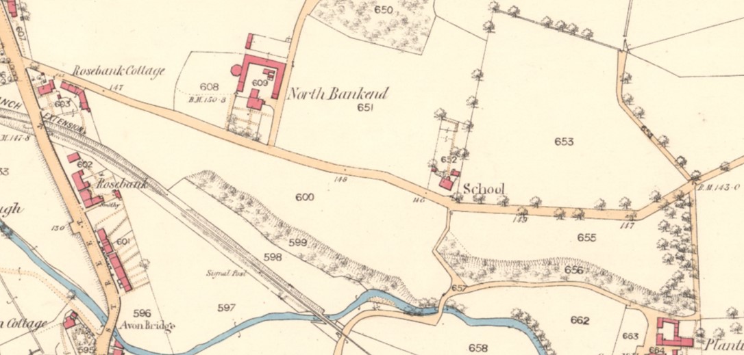 The original centre of Dunipace lay at the east end of the parish at the Hills of Dunipace. Just as the parish church was located there, so too would have been the early parish school. By the late 17th century the centre of population had drifted to the west end of the parish and after a time lag the school would have been moved there. The “schoolhouse at the Thorn” is mentioned as early as 1715 (Reid notes) and this must have been the one referred to in the New Statistical Account as having been built in 1696. The site was on the north side of the road from Denny to the Hills of Dunipace, just to the east of North Bankhead Farm and the area was known as Thorn due to the shape of the land enclosed by the confluence of the Avon Burn and the River Carron. The settlement was rather dispersed and so it is not surprising to see the school set in an isolated rural setting. The map shows that the road from the south was created to make access to the school easier.