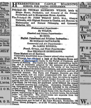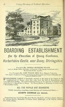 Herbertshire Castle was leased to Thomas Wilson Richmond in 1877 for use as a boarding school for young gentlemen under his rectorship. He had successfully run two such schools in Sunderland and Perthshire, and the Herbertshire Castle Boarding School opened on 4 September. The newspaper advertisement says that the schoolrooms were separate from the house which was used as bedroom accommodation, dining and lounging. Presumably the classes were held in the east wing. A cricket team was quickly established, though they were thoroughly beaten when they played the nearby established private school of Blair Lodge, Polmont. Fox hunting, of a sort, was also indulged in. Three “foxes,” selected from the older pupils, would leave the house twenty minutes before their pursuers – the hounds – and left a trail of sawdust at intervals for them to follow. The hunt would cross farmers’ fields as well as run along roads or canal towpaths and could cover up to twenty miles. Usually the foxes were back at the house long before the hounds and some of the hounds got lost and had to hire taxis to get back. These were bi-annual events and caused much amusement amongst the local population. Military drill was on the curriculum and in 1880 Louis Saurin composed a grand military march called “The Herbertshire Castle.” The younger locals were invited into the grounds to make supervised use of the sporting facilities – a form of outreach that is familiar today. The vice-principal, JW Reid, also gave lectures in the church halls of the area.